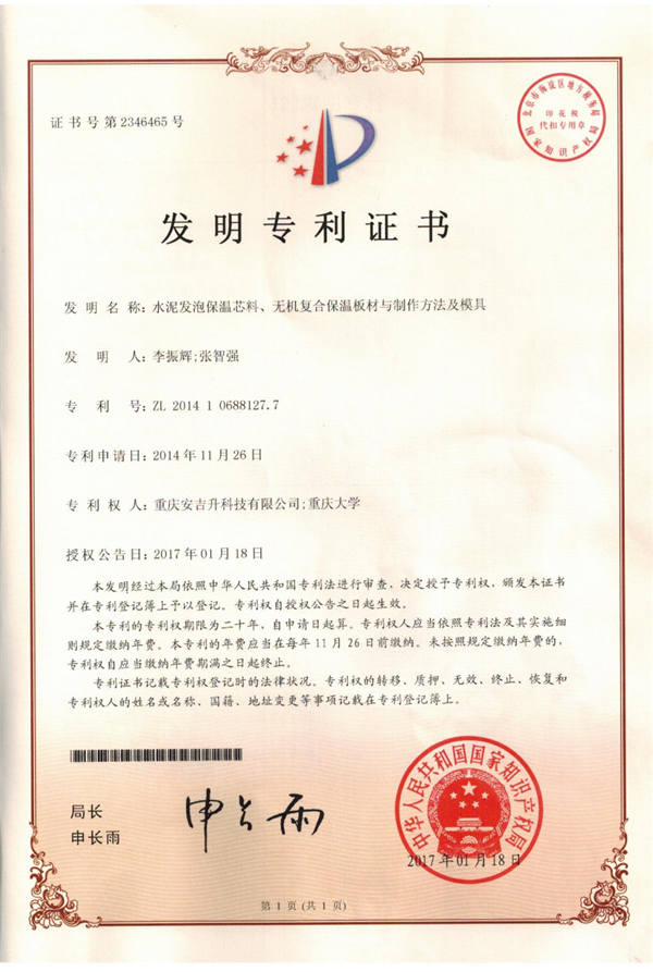 重慶安吉升專利:水泥發泡保溫芯料、無機復合保溫板材與制作方法及模具 CN104478354B 發明專利 公告日期2017-01-18